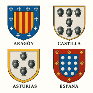 • Castilla: Campo de plata con cinco calderas negras en forma de sotuer, bordura de oro.